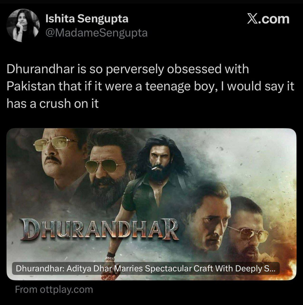 The reaction to Dhurandhar reveals something deeper than a routine ideological disagreement—it exposes panic. For decades, control over Indian cinema’s “acceptable” narratives rested with a narrow left-liberal ecosystem that dictated who could tell stories, how nationalism could be portrayed, and which conflicts were morally legible. That ecosystem is now losing its monopoly.