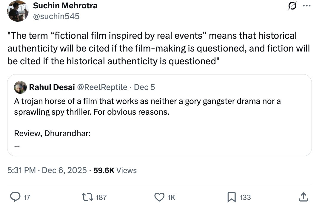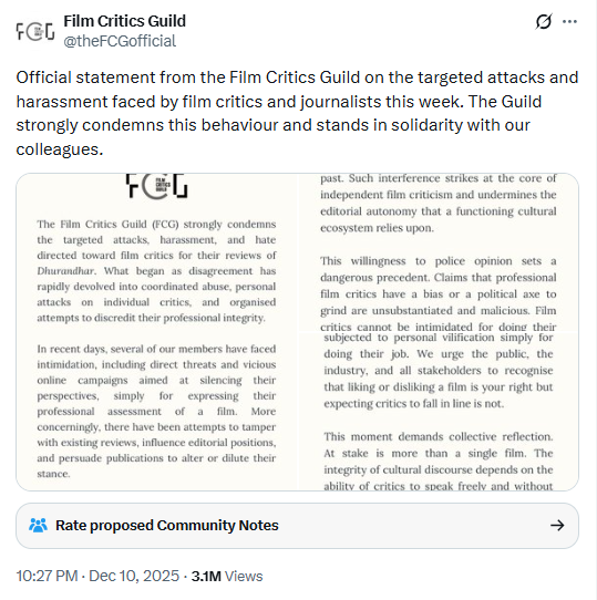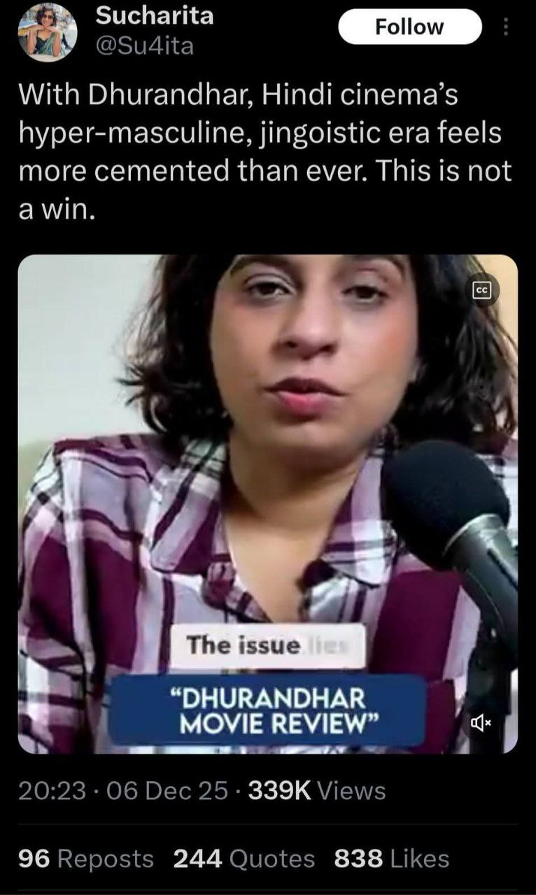 So they used a body that they have created (Anupama Chopra is the Chairperson of FCG) to denounced everyone who was criticizing these critics. The statement was positioned as a defense of “editorial autonomy” and “independent criticism”. (Source: Private body ‘Film Critics Guild’, headed by critics Anupama Chopra and Sucharita Tyagi, condemns criticism of their reviews of Dhurandhar / Opindia)