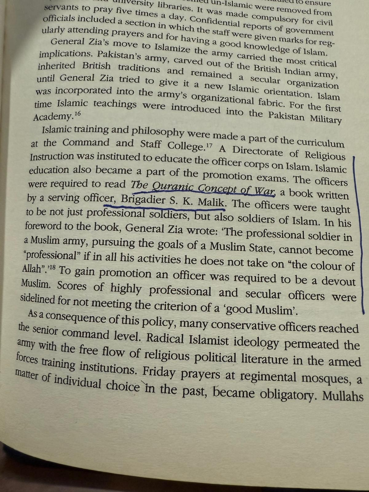 The passage we shared earlier (about Zia-era Islamization of the army and required reading of The Quranic Concept of War) matters because it signals how a military can be trained to treat religion-infused psychological warfare as doctrine, not rhetoric. A widely cited Zia line—used in military studies of Pakistan’s strategic culture—frames “professionalism” in explicitly religious terms (“the color of Allah”), tying soldiering to an ideological mission.