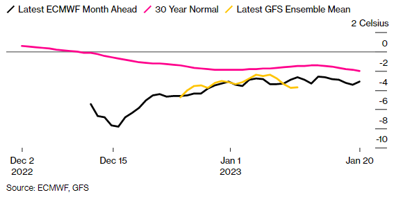 Falling wind speeds in Europe are pushing power and gas prices higher, underscoring the heightened vulnerability of the continent’s energy system to weather conditions this winter. Amid a sharp pivot from its reliance on Russian natural gas, Europe has built up large reserves of stored gas ahead of this year’s heating season. That has helped ease power and gas prices recently. A particularly mild spell of weather across the continent also helped by pushing back gas withdrawals and keeping stockpiles topped off. (Source: "Lack of Wind Pushes Europe’s Power Prices Higher, Just as Cold Sets In" / Wall Street Journal)