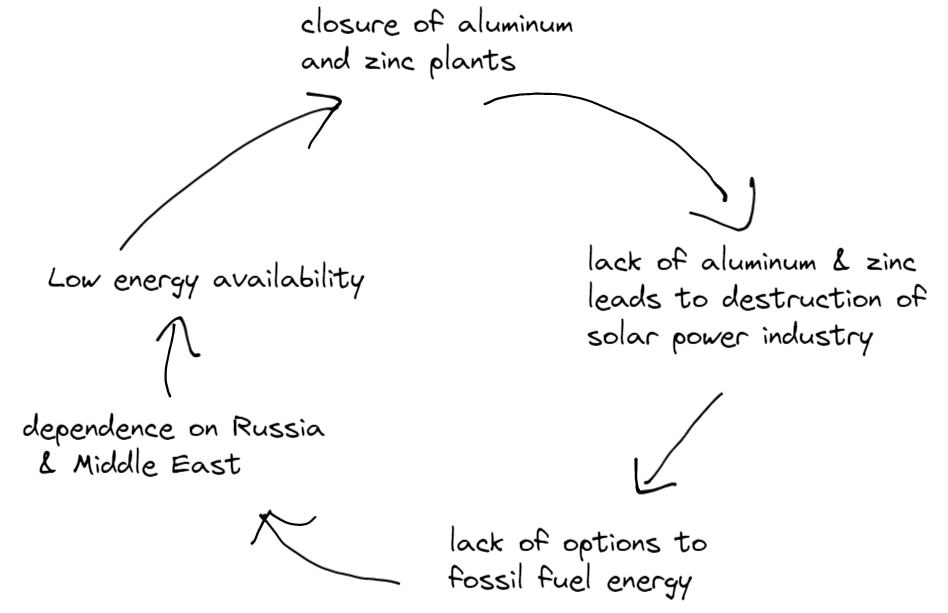 If the lack of energy - due to the situation with Russia - forces the closure of Aluminum and Zinc factories leading to the destruction of 50% or more of Europe's production capacity - then it directly impacts Europe's ability to manufacture solar power equipment. Which keeps its dependence on fossil fuels intact. With winds varying in their intensity based on the weather, the situation is quite bad!