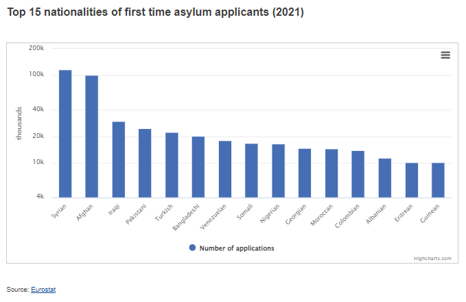 In 2021, 183,600 people seeking asylum were under 18 years old – nearly 13% of them (23,300) were unaccompanied children. Most of unaccompanied children came from Afghanistan, Syria and Bangladesh. In the first half of 2022, 405,500 asylum applications (from which 365,400 first time applications) were lodged in the EU. This is 63% more than in the same period of 2021, and also 21% higher compared to pre-COVID times (same period of 2019). In March 2022, the number of applications exceeded 80,000, the highest monthly level since 2016. (Source: European Commission)