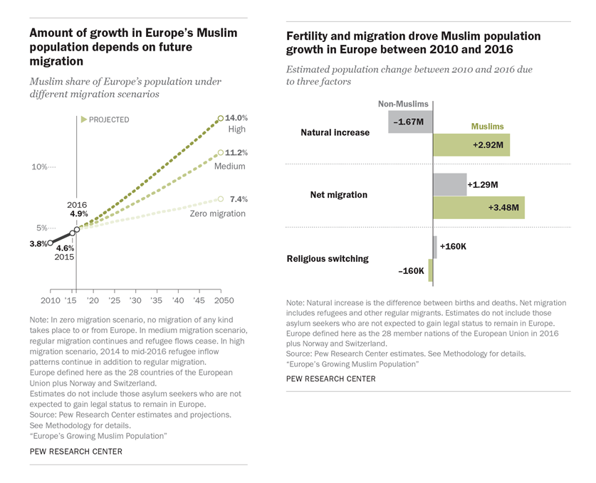 Looking at it another way, 50% of all European Muslims are under the age of 30, compared with 32% of non-Muslims in Europe. In addition, the average Muslim woman in Europe is expected to have 2.6 children, a full child more than the average non-Muslim woman (1.6 children). (Source: 5 facts about the Muslim population in Europe / Pew)