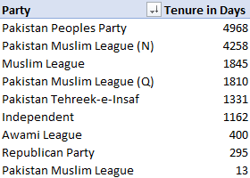 In terms of tenure and length of rule, the Pakistan Peoples Party has had the longest stint in power. There have been several avatars of the "Muslim League".