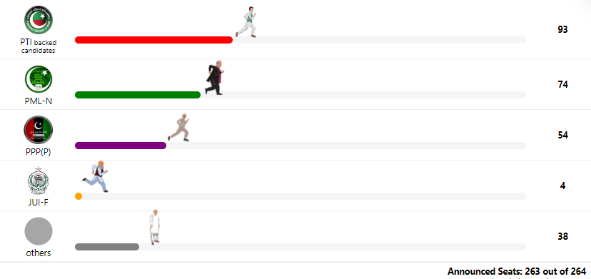 Although the Election Commission of Pakistan (ECP) has failed to announce the final election results even after passage of two days after completion of the voting process in entire Pakistan, unofficial and unverified election results show that the Pakistan Muslim League-Nawaz (PML-N) is leading the race for the Punjab crown from the front. According to the unofficial and unverified election results, the PML-N has won 137 seats, while independent candidates backed by Imran Khan's Pakistan Tehreek-e-Insaf (PTI) have won 116 seats in Punjab so far. Punjab, which is the largest province of Pakistan in terms of population, has 297 provincial assembly seats in total. Independent candidates not supported by the PTI have won 22 seats. (Source: General Elections 2024: PML-N leading the race in Punjab with PTI on its heals / Daily Pakistan)