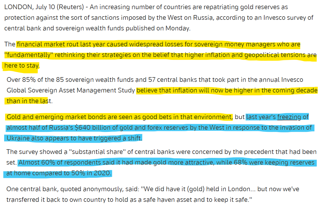 It made countries outside the Western countries sit up and think. As Rod Ringrow, Invesco's head of official institutions, said - countries want to get their gold in their own hands! (Source: Countries repatriating gold in wake of sanctions against Russia, study finds / Reuters)