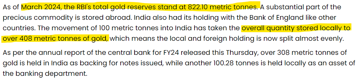 In recent months, India's RBI brought home over 100 tons of gold from the UK to its domestic vaults in India. This marks the first significant transfer of gold reserves on such a scale since 1991.