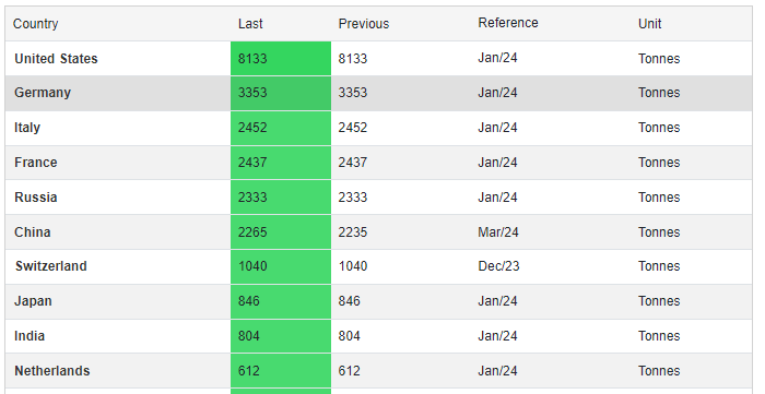 Currently, the top 10 countries by gold reserves is this. It is always changing but it gives a good indication of the major holdings.
