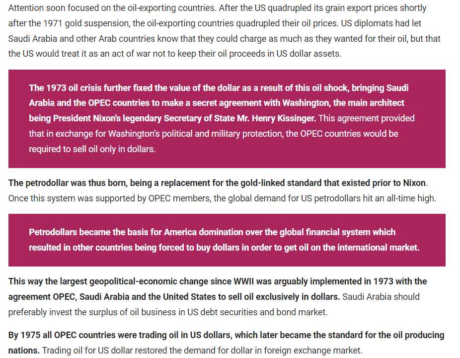 And so, just in a few months in 1973, a deal was struck with the Saudis to sell oil only in US Dollars. The other countries had to follow suit.