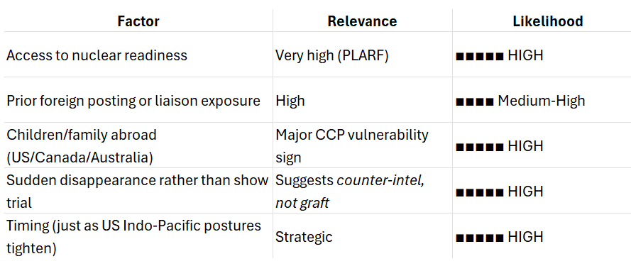The pattern indicates Xi is not worried about stolen money. Instead, he is worried about compromised loyalties, covert influence networks, or embedded foreign access channels inside China’s war-fighting core.