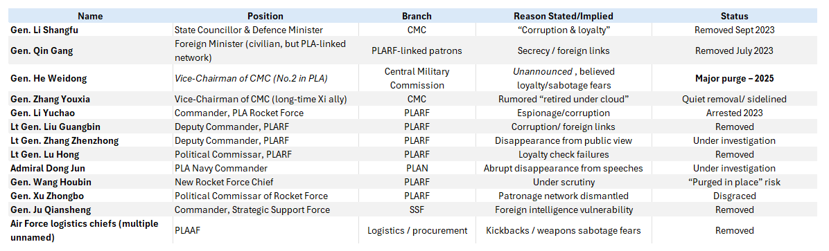The entire leadership of the PLA Rocket Force, along with senior figures in space, cyber, and naval commands, has been abruptly removed.