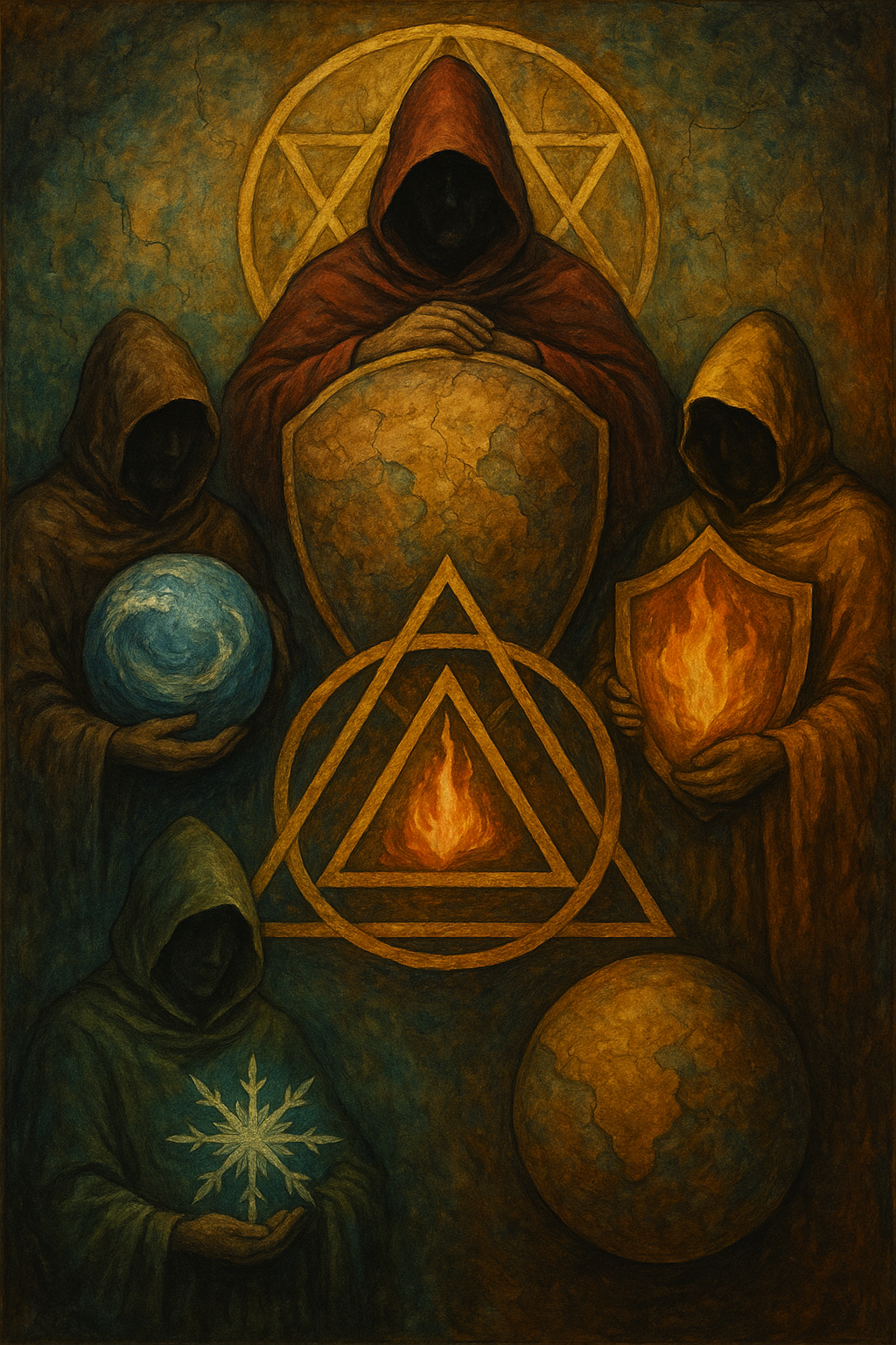 The monk watched as they turned their backs — not on each other, but on the world behind them. They were not united, yet not divided; not allies, yet not enemies. Each held their element close, protecting it from the others — and from the sky above.