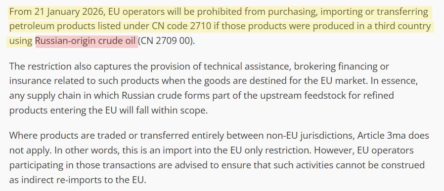 Beginning January 21, 2026, a new EU rule will require proof-of-origin certification for refined fuels, explicitly targeting India-Turkey-China routing. This is Europe trying to prevent future “laundering” without admitting present dependence.