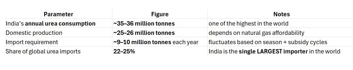 Even small supply shocks translate into massive fiscal exposure for the state. This is why securing low-cost upstream production is not just an agricultural issue but a budgetary and political one. The Indian government pays a whopping 80-90% subsidy for urea (Link: Economic Times)!