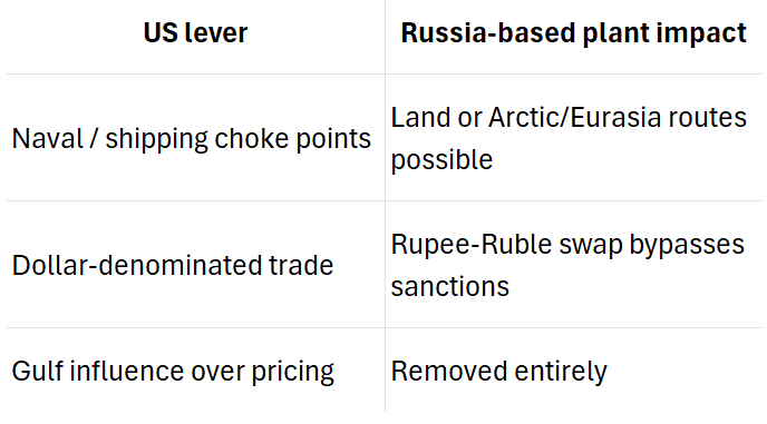 The financial architecture is just as crucial as the fertilizer: payment in rupee–ruble bypasses the petrodollar system and creates a sanctions-resilient settlement corridor. Once production is inside Russia and denominated in a currency other than the dollar, U.S. pressure tools lose effective leverage.