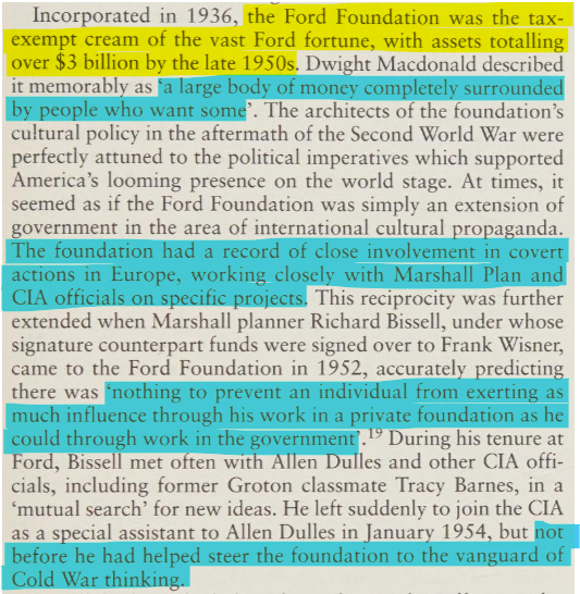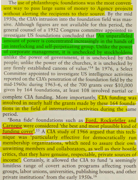 Why would that have been an issue? Because at that time specifically, it was a considered CIA policy to use donor and non-profit organizations like Ford Foundation and Rockefeller for its covert activities so that they could hoodwink the target countries.