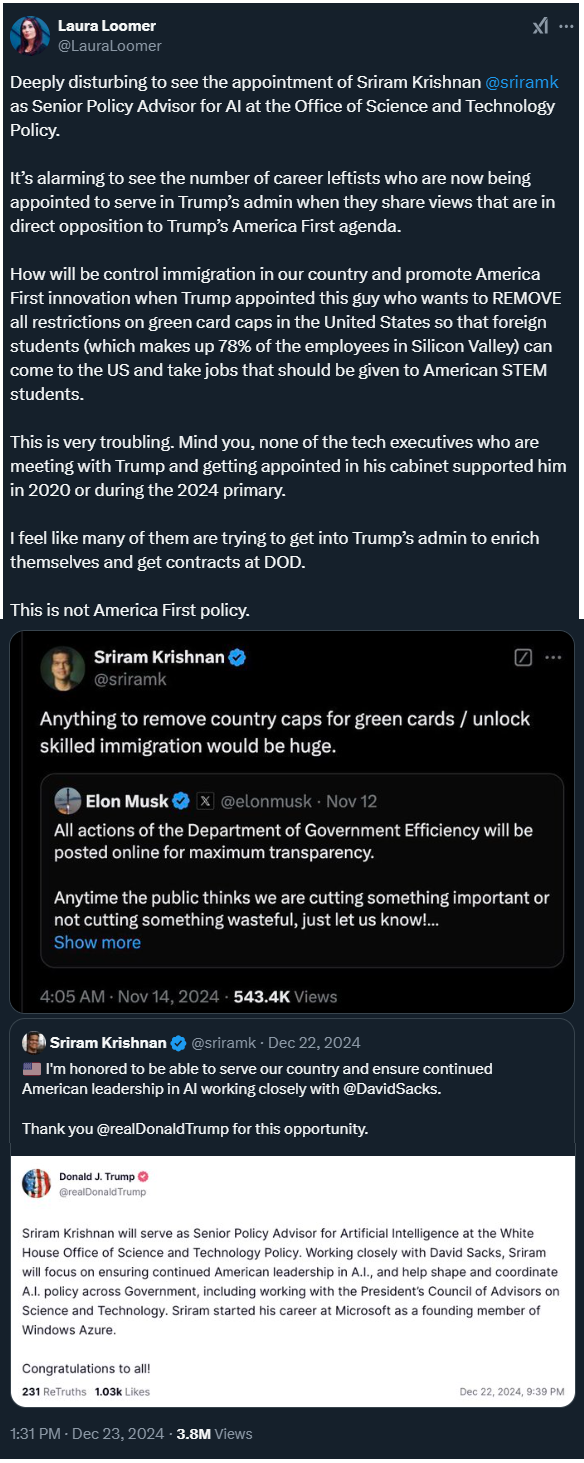 She went after Trump's appointment of Sriram Krishnan as the Senior Policy Advisor for AI of the Office of Science and Technology Policy.