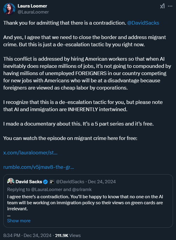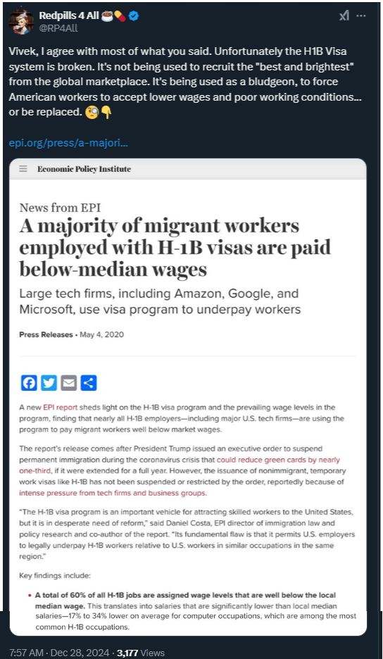 Her pet peeve - Sriram's argument for removing the Green Card limiting cap that throttle many within the tech pool to keep working as H1B which is a broken regime anyway.