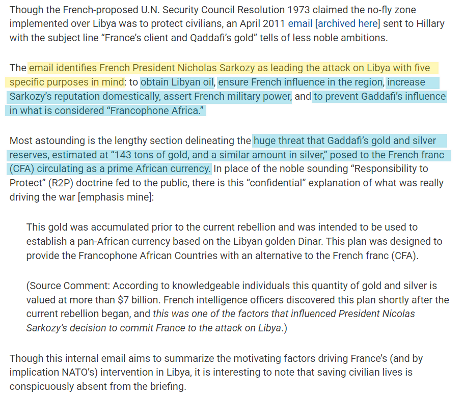 Libya's Gaddafi made that mistake. He threatened the CFA regime. So, Sarkozy worked with Hillary to depose him and turn Libya's prosperous society into a place where men and women were being sold on the streets post-invasion!