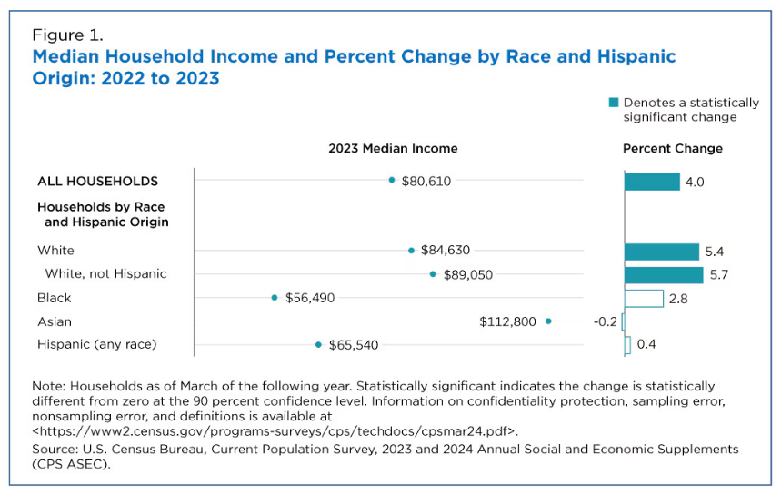 Compare this to the other ethnic groups and we can see the difference. The average household income for "all American households" is $80,610. For the Whites-not-Hispanic, it is $89,050; for Hispanics it is $65,540; for Blacks it is $56,490 and for the Asian Americans it is $112,800. In contrast, for the Indian-Americans, it is $145,000.