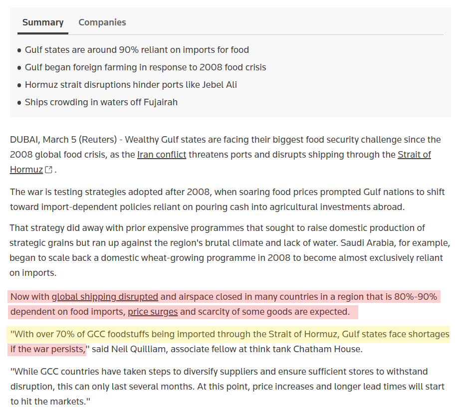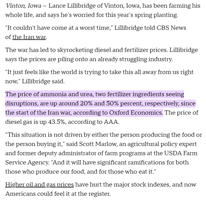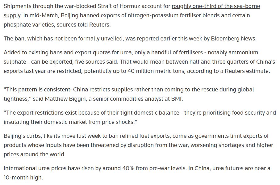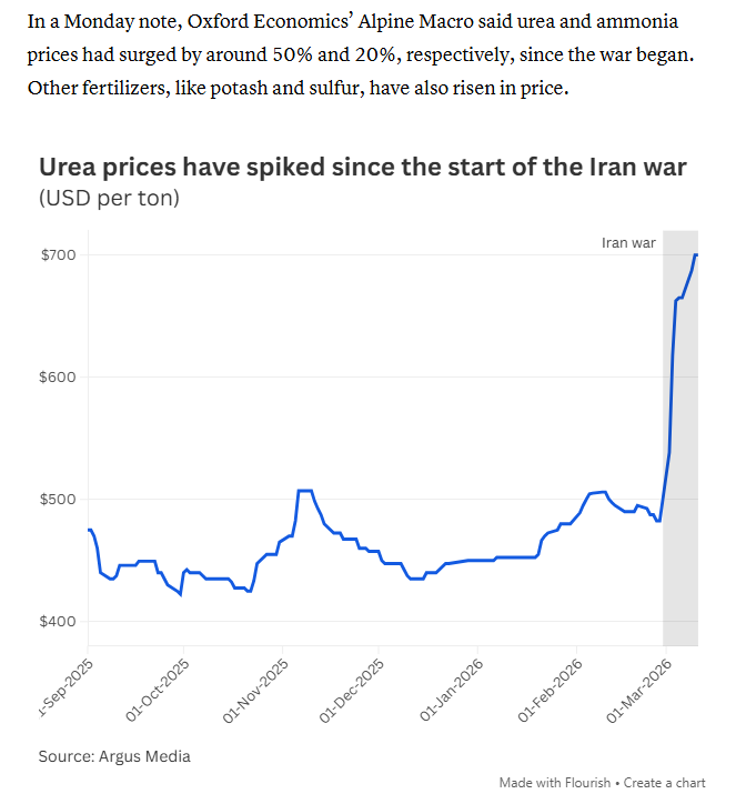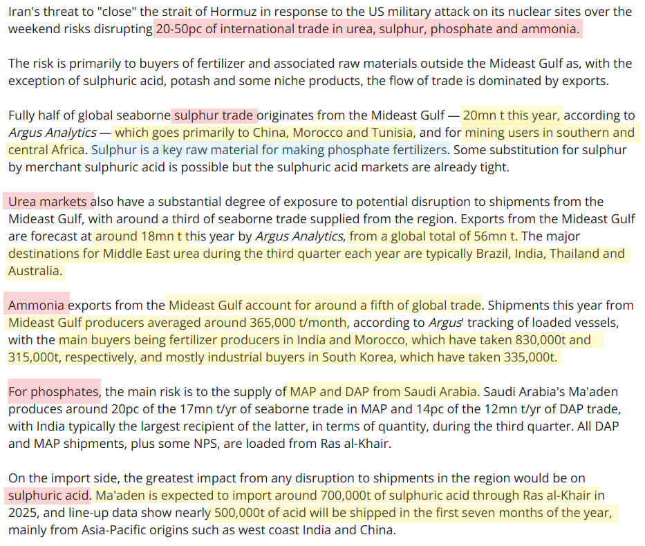 "Almost 50% of all globally traded sulfur comes from that region. For urea, it's around a third of all globally traded urea that comes from that region and for ammonia, it's close to 25%." (Source: It’s not just oil and gas. The Strait of Hormuz blockage is rattling another vital commodity / CNBC)