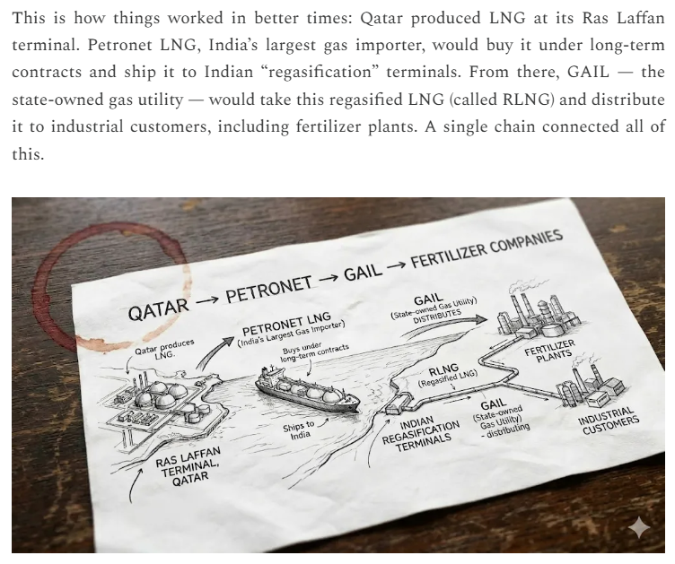 India manufactures roughly 28–29 million tons of urea domestically, against annual consumption of 35–36 million tons. The difference is imported, mostly from the Gulf. But Indian domestic production itself relies on LNG imports from Qatar to fuel its plants.