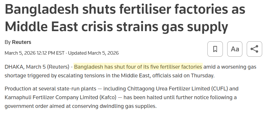 Bangladesh has had to shut down fertilizer factories as Middle East crisis strains gas supply. Egypt has lost its gas imports from Israel and must turn to the ever-pricier LNG market. The benchmark price of urea, the most widely traded fertilizer, is up about 30 percent in the last month.