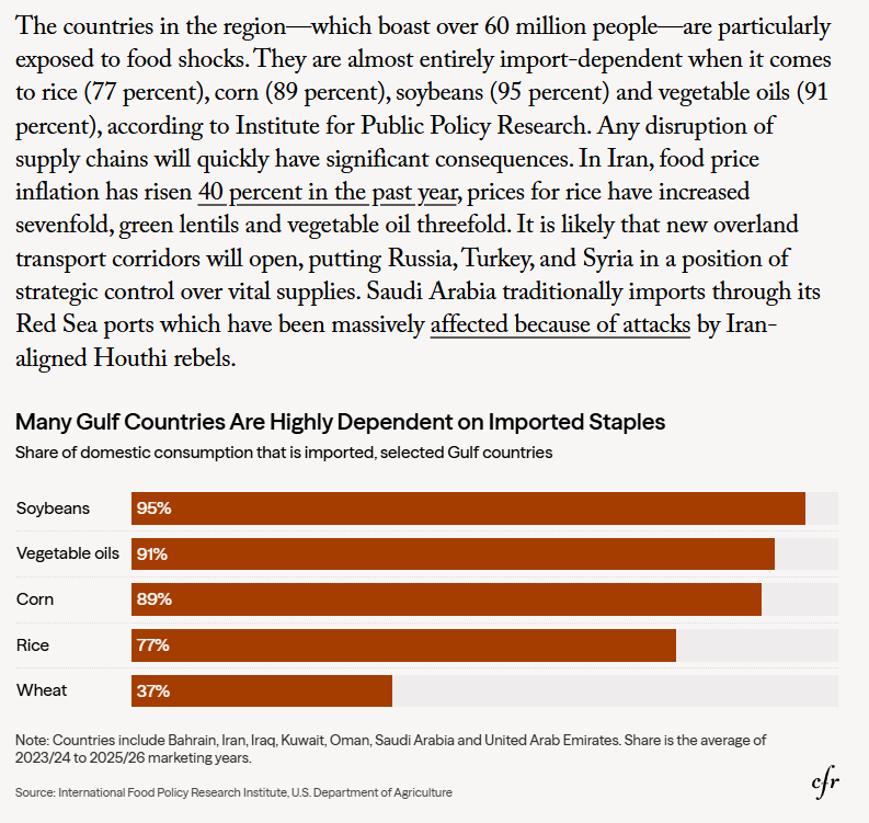 It's also that fertilizer producers elsewhere lack key ingredients — the second-order effects of a supply chain crisis. (Source: The Other Global Crisis Stemming From the Strait of Hormuz’s Blockage / Carnegie Endowment).