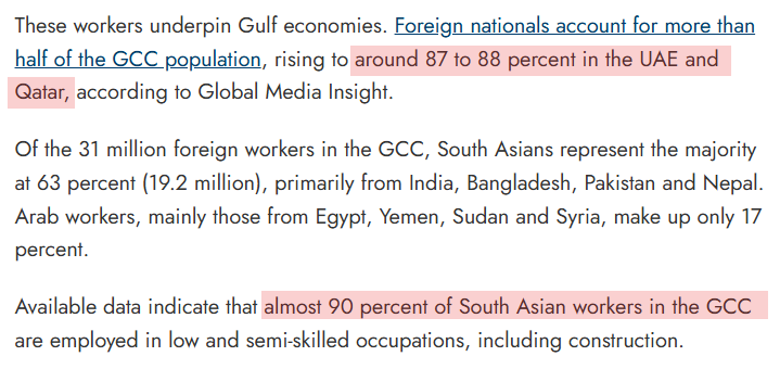 These workers are not peripheral. They are the operational substrate of Gulf civilization — running the ports, construction sites, logistics networks, hospital wards, power-plant maintenance crews, desalination plant operations, and food warehouses. Gulf citizens largely hold government, military, supervisory, and professional roles. The physical economy runs on South Asian labor.
