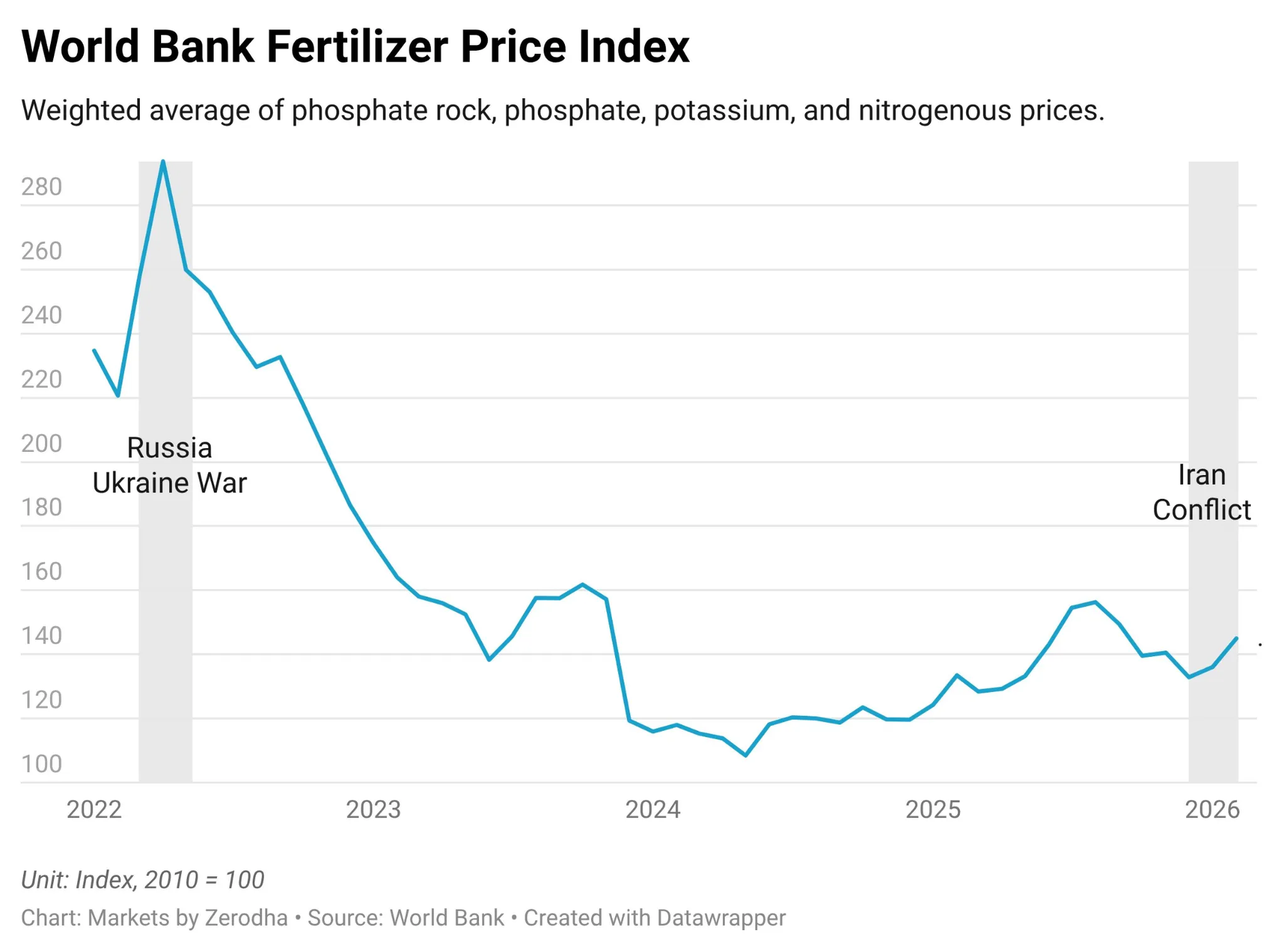 For context, one ton of urea costs U.S. farmers the equivalent of 75 bushels of corn in December 2025; by early March, one ton of urea costs the equivalent of 126 bushels. The affordability ratio for fertilizer versus crop output — what the Rabobank urea affordability index tracks — has fallen to its second-lowest level since 2010. Farmers across the Northern Hemisphere face the same brutal arithmetic: fertilizer costs have risen faster than the value of the food they will produce.