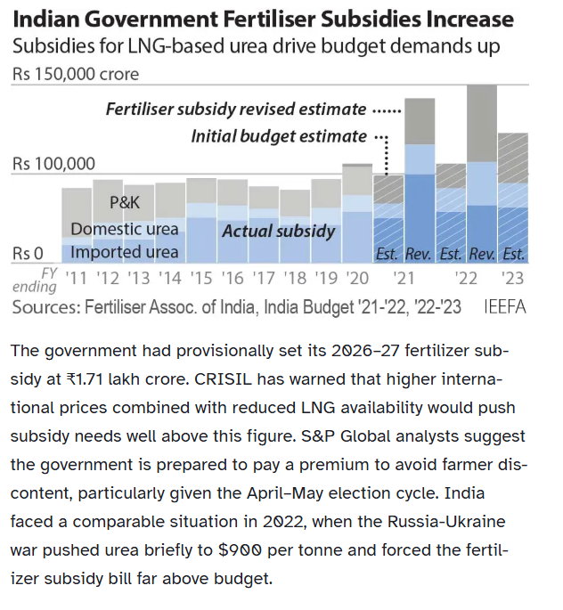 The fiscal dimension compounds the operational one. India's provisionally budgeted fertilizer subsidy for 2026–27 was ₹1.71 lakh crore (Source: PIB)— already stretched before the war.