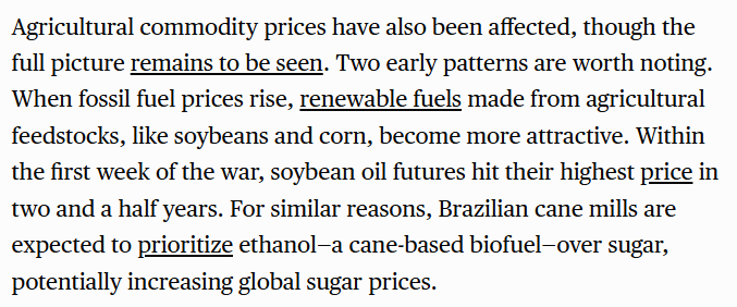 Brazilian cane mills are already shifting toward ethanol rather than sugar, and soybean oil futures hit their highest level in two and a half years within the war's first week.