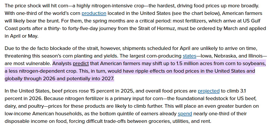 To be clear, about half of fertilizer is not traded internationally at all. The United States, a land of abundant natural gas, produces about three-quarters of the fertilizer it consumes, while China is even more self-sufficient. But because these are globally traded commodities, problems in one place ripple throughout the global economy. Even before the war in Iran, China was restricting fertilizer exports to protect its own farmers—but it needs Brazil, which is highly dependent on Middle Eastern urea, to be able to grow soybeans to feed to the pigs and cows in both countries. (Source: The Other Global Crisis Stemming From the Strait of Hormuz’s Blockage / CSIS)