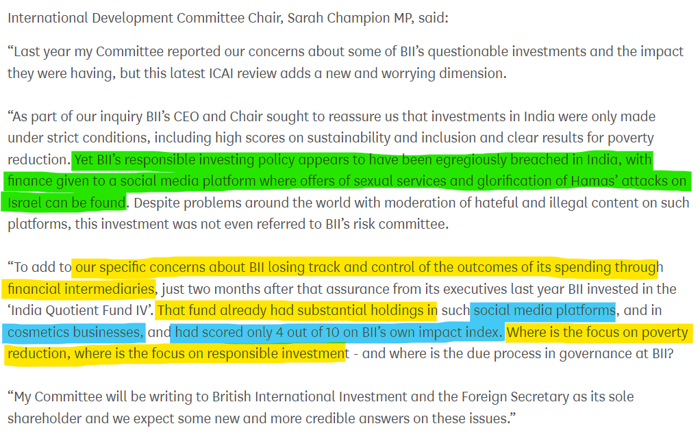 As far as BII investments in India are concerned it prefers to invest in social media platforms where sexual services are offered and the October 6th Hamas attack on Israel was eulogized.