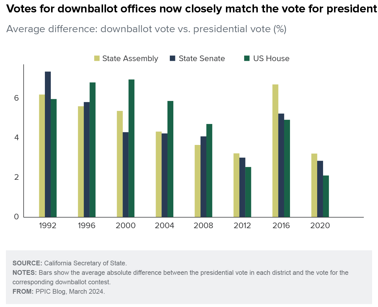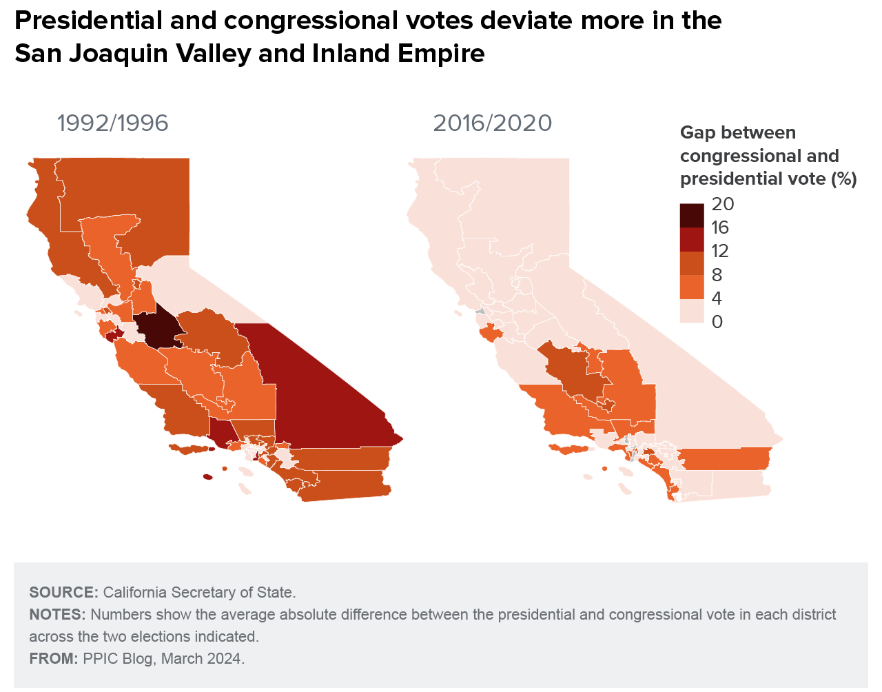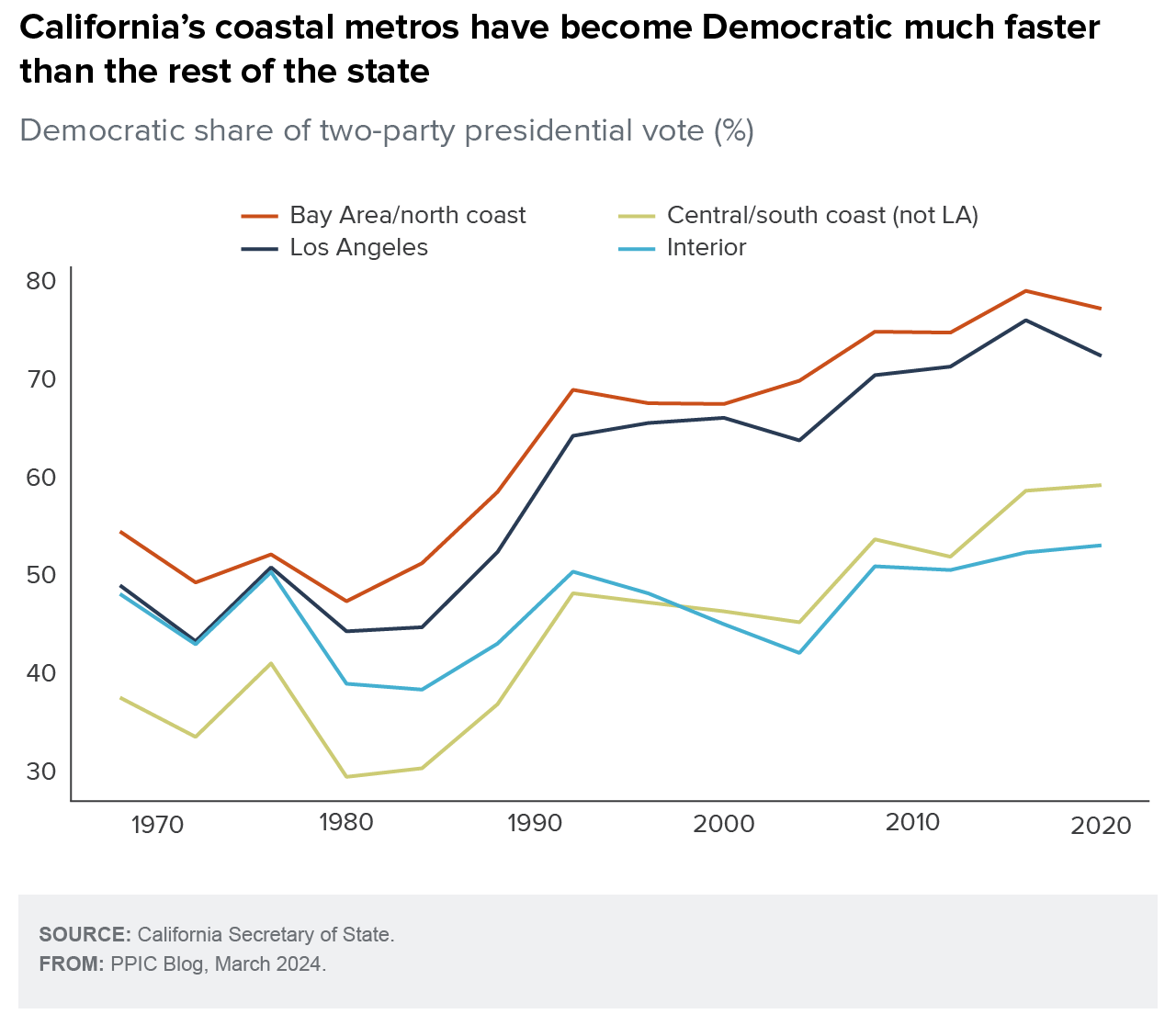 - California has voted for the Democratic presidential candidate in every election since 1992, with margins becoming increasingly lopsided