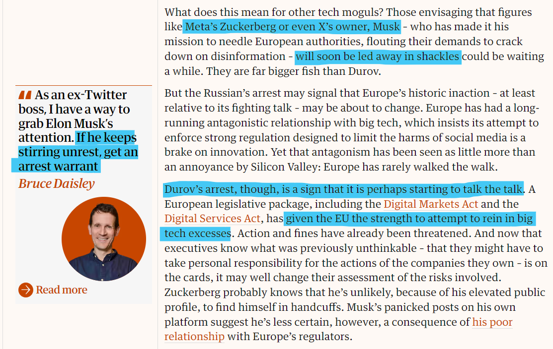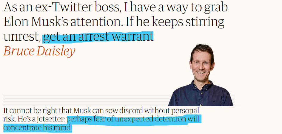 Here is an opinion piece on August 12th, where Bruce Daisley calls for arresting Elon Musk and using it to bend him to the dictates of European politicians.