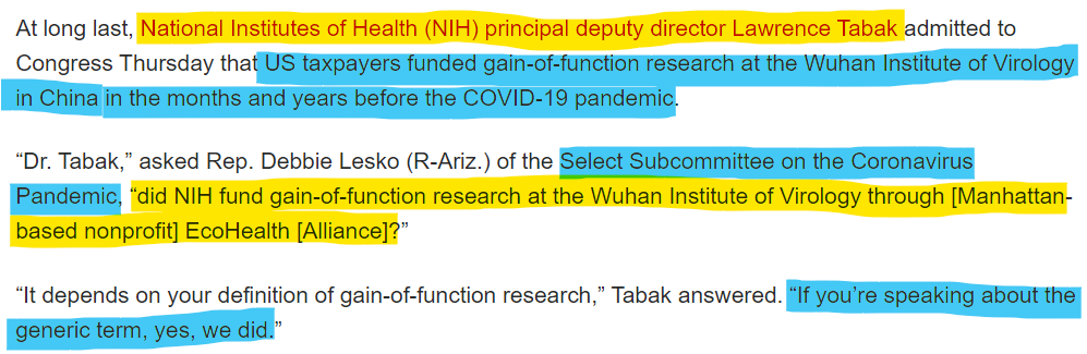 In 2024, Lawrence Tabak, the principal deputy director of the NIH, confirmed that U.S. taxpayer funds were used to finance gain-of-function research at the Wuhan Institute of Virology (WIV) via a grant to EcoHealth Alliance.