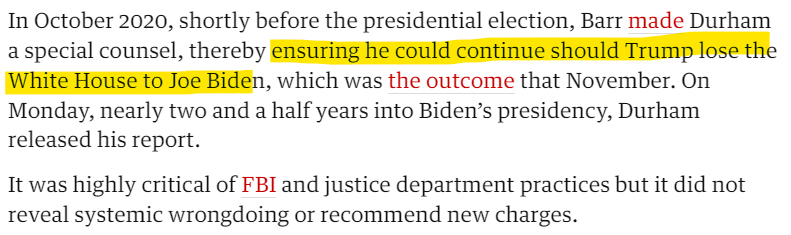 In October 2020, shortly before the presidential election, Barr elevated Durham to the status of special counsel. This appointment ensured that Durham could continue his investigation even if Trump lost the 2020 election, which he eventually did!
