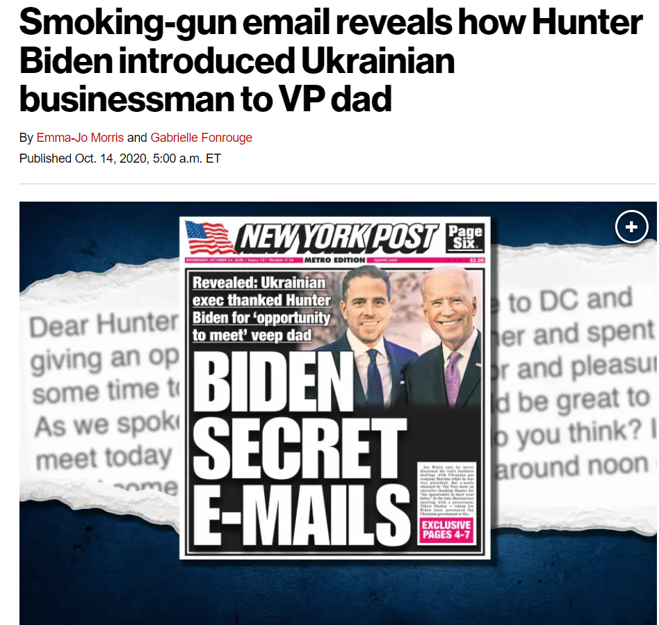 A laptop that was said to be belonging to Hunter Biden, son of then-presidential candidate Joe Biden, was left at a computer repair shop in Delaware in 2019. The laptop's hard drive contained emails, documents, photos, and other data. The New York Post published a front-page story on October 14, 2020, presenting emails from the laptop that clearly showed corruption involving Joe and Hunter Biden. The story claimed to reveal questionable business dealings, particularly related to Ukraine and China.