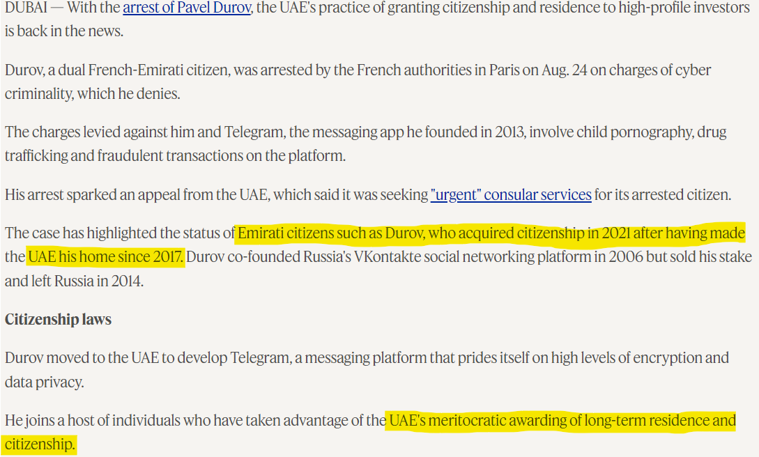 Pavel Durov moved from Russia when he sold his stake in VKontakte - a social media networking platform in 2014. He started residing in UAE in 2017 and in 2021 was given citizenship.