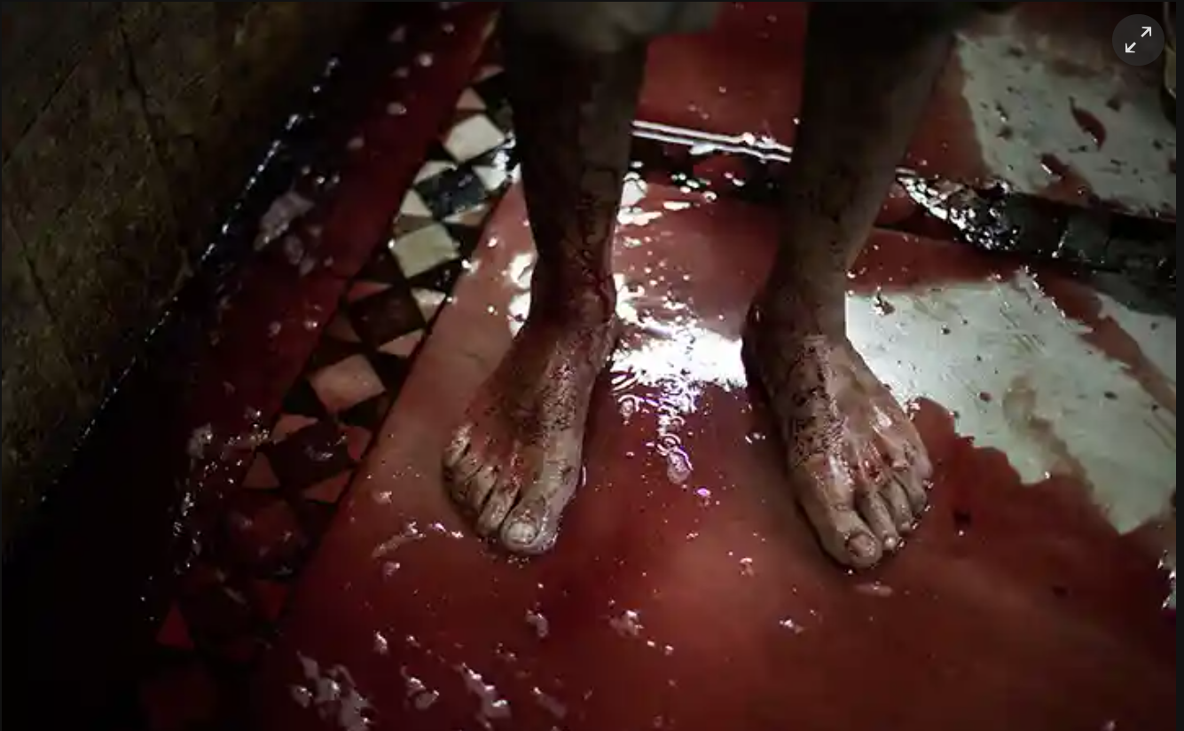 Animal feces on the floor, guts of the already slaughtered lying around, and blood on the walls.