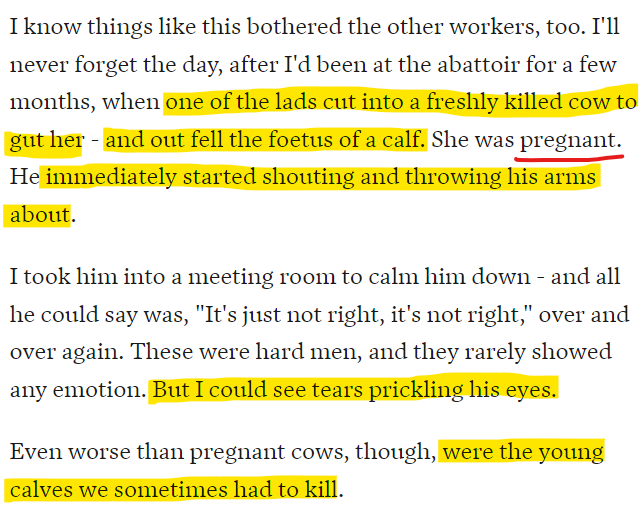 In a remarkable essay on BBC, people who worked at the slaughter house shared their experiences and impact on their minds, well-being and lives. How did just normal human beings - people who would love animals to a point that they wanted to be vets and care for young animals - ended up slaughtering innocent, loving and crying animals with a numbness that resembled the ways of serial killers.