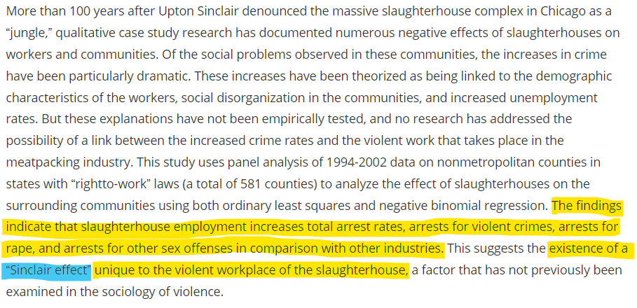 There is enough empirical data that violent and sexual crimes increase significantly in the area near the slaughterhouses.