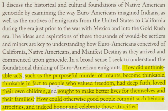 Brendon Lindsay in his book titled "Murder State: California's Native American Genocide, 1846-1873" asks two very poignant questions about the genocide perpetrated by the European settlers on Native Americans.