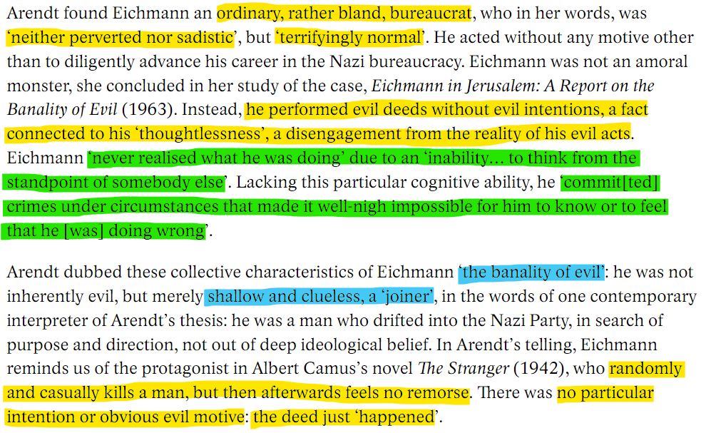 The philosopher Alan Wolfe, in Political Evil: What It Is and How to Combat It (2011), criticised Arendt for ‘psychologising’ – that is, avoiding – the issue of evil as evil by defining it in the limited context of Eichmann’s humdrum existence. Wolfe argued that Arendt concentrated too much on who Eichmann was, rather than what Eichmann did. For Arendt’s critics, this focus on Eichmann’s insignificant, banal life seemed to be an ‘absurd digression’ from his evil deeds. (Source: "What did Hannah Arendt really mean by the banality of evil?" / Aeon)
