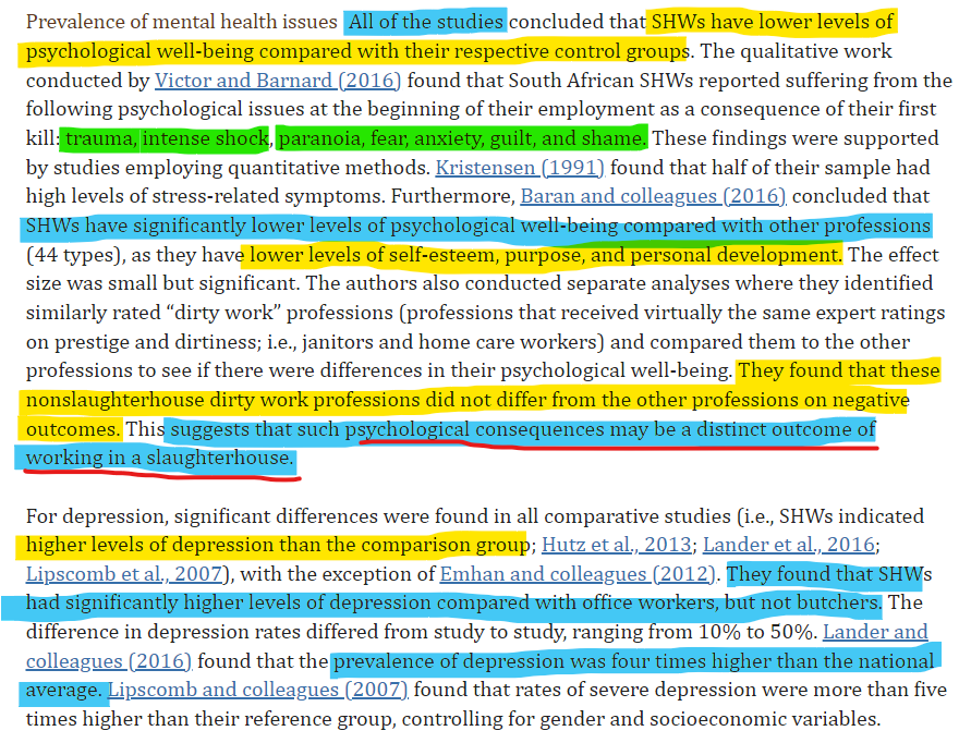 Extensive and peer-reviewed studies have been done on the impacts of slaughterhouse jobs on peoples' well being.