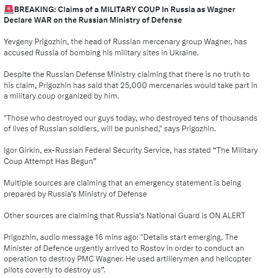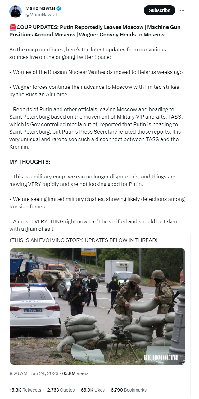 On June 23rd, Mario Nawfal shared a tweet with the information that a military coup was underway in Russia as the Wagner PMC group under Yevgeny Prigozhin was moving ahead and had accused Putin of bombing his military sites.