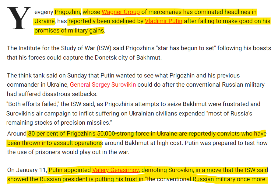 - January 11th, Putin replaces Sergey Surovikin with Valery Gerasimov signifying (as Newsweek reiterated) a return to the trust in conventional Russian military as opposed to the Wagner mercenaries.