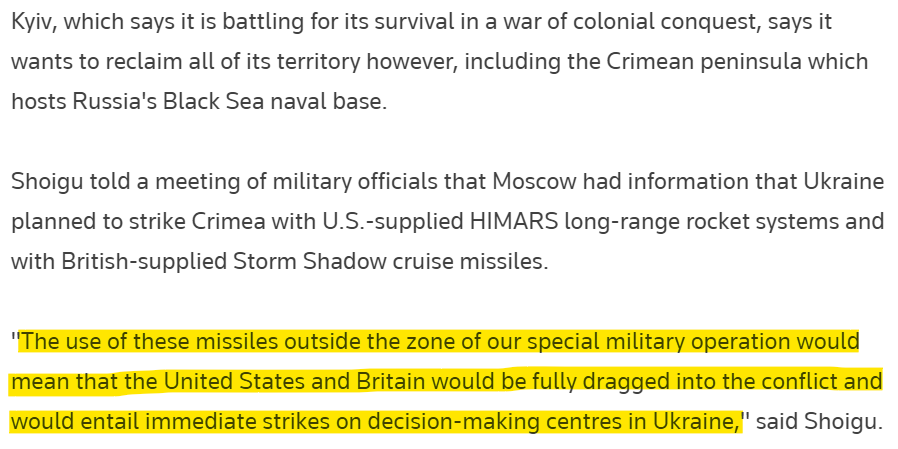 On June 20, 2023, Russian Defense Minister Sergei Shoigu stated that "Moscow had information that Ukraine was planning to strike Russian-controlled Crimea with longer-range U.S. and British missiles and warned Russia would retaliate if that happened."