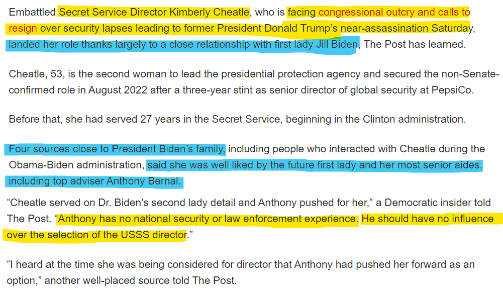 Now, the plot thickens when you read the New York Post's revelation that the current Secret Service Director, Kimberly Cheatle, is close to Jill Biden and was appointed due to a push by Mrs Biden.